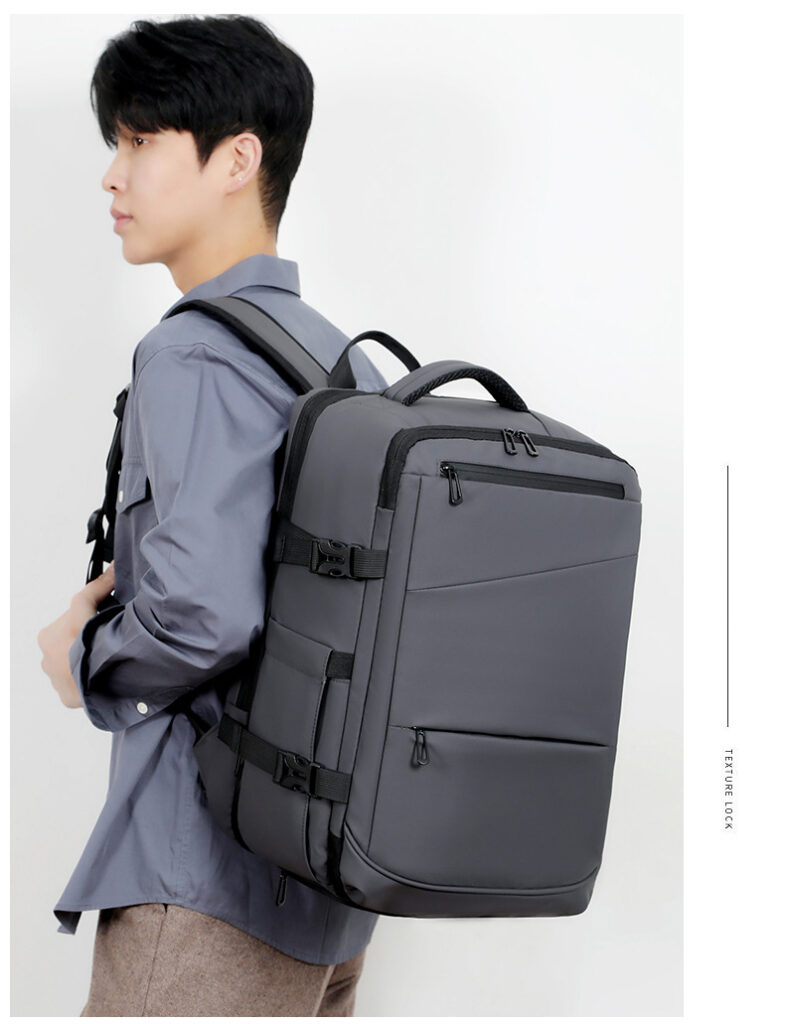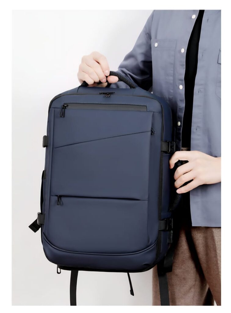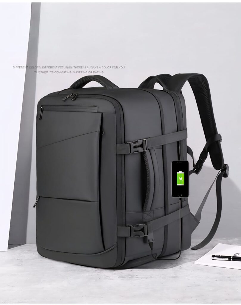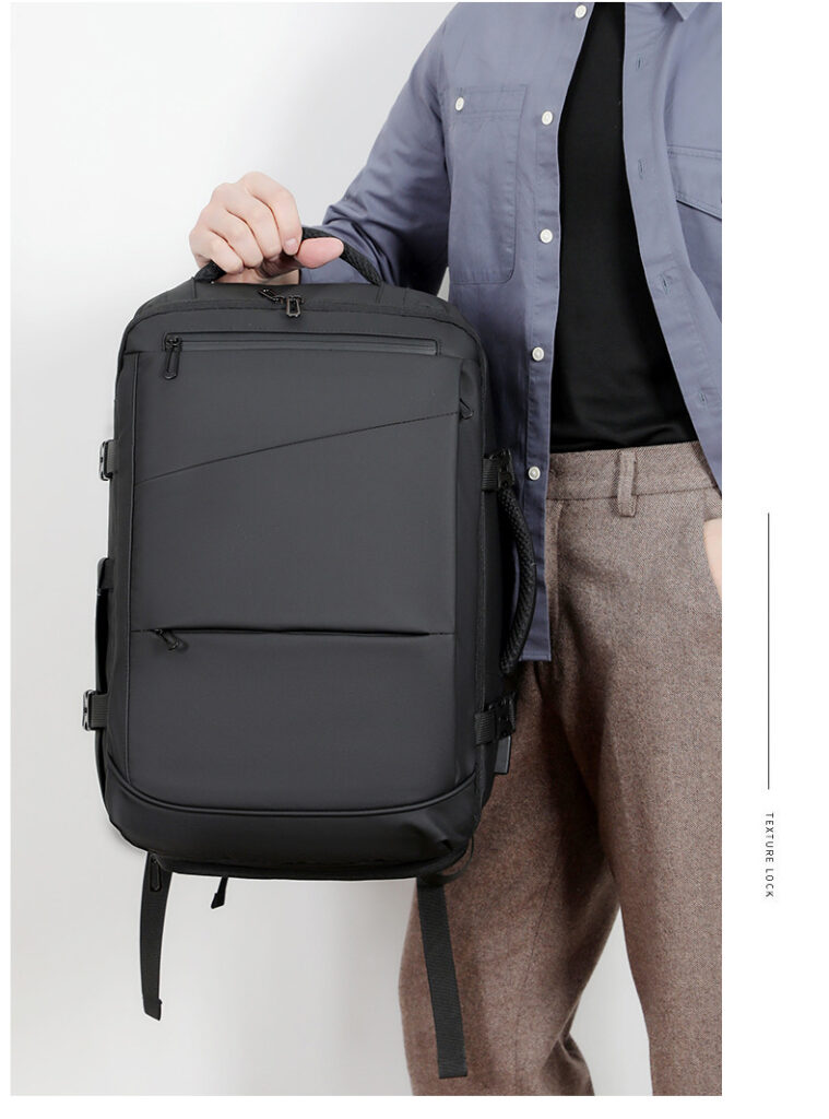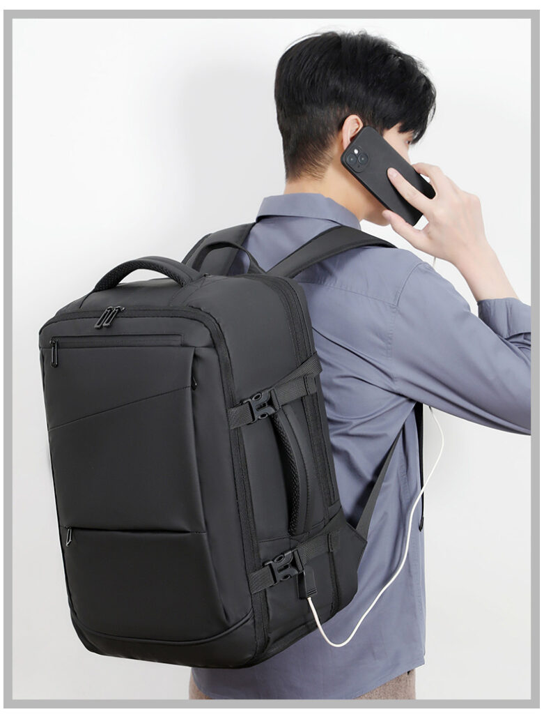 Travel and daily routine backpack with expandable features designed for convenience and versatility. It features a dedicated shoe compartment, multiple organized pockets, and a USB charging port to keep your devices powered on the go. Built with waterproof material, this backpack is perfect for weekend trips,  or everyday commuting—combining style, durability, and functionality in one.