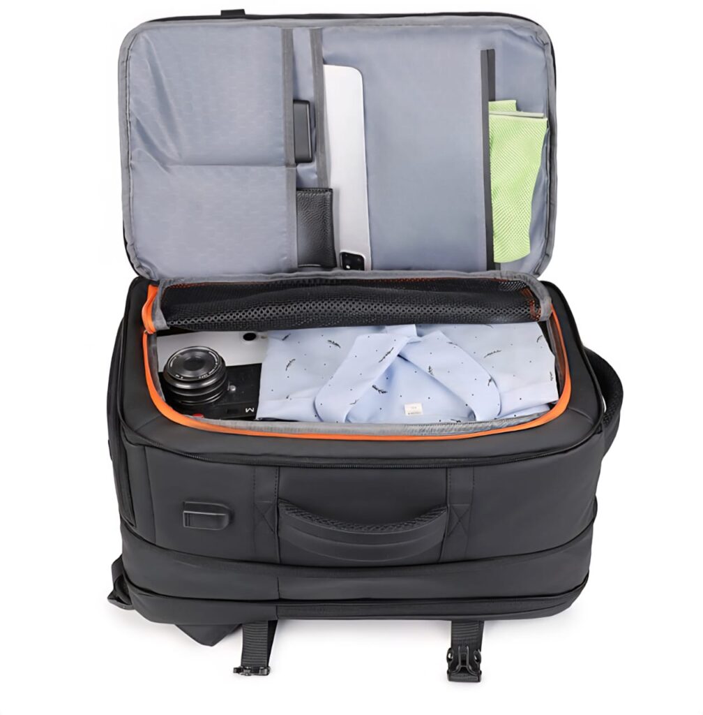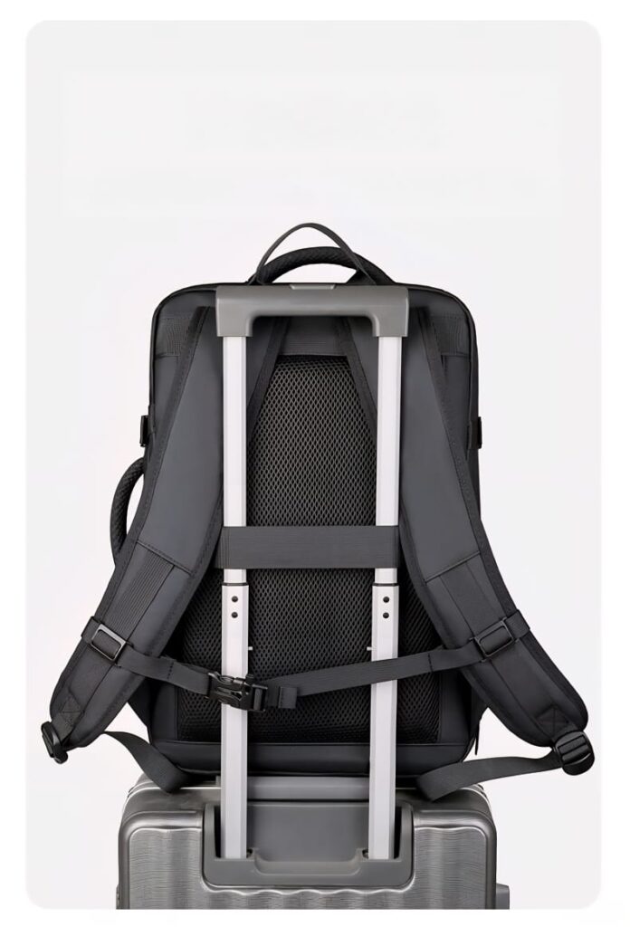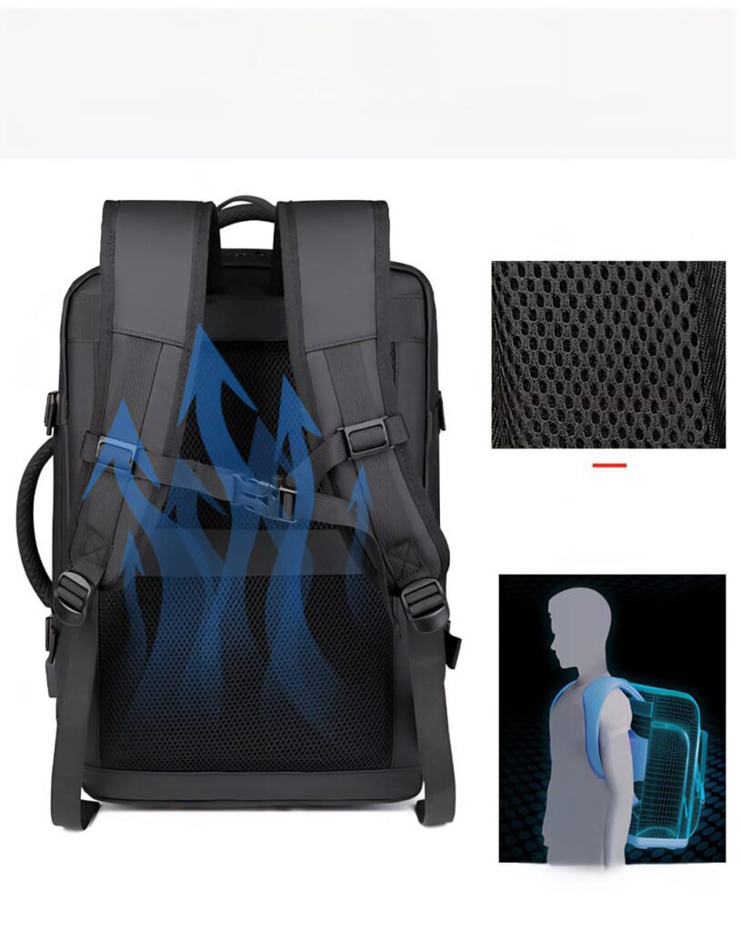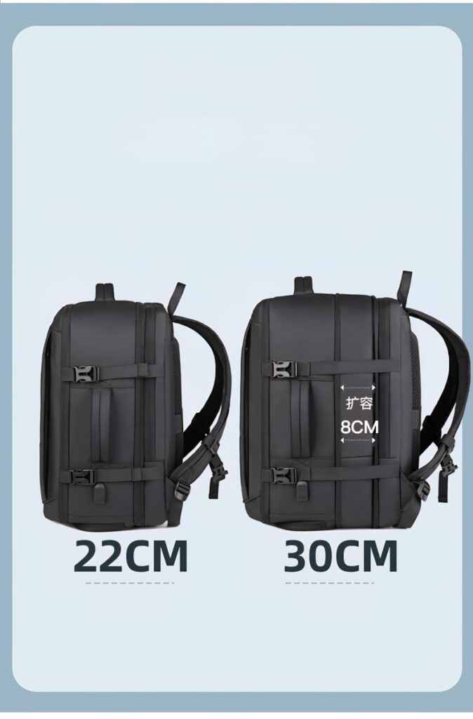 The backpack has a spacious interior and is suitable for carrying a 17″ laptop. The backpack is made of durable and waterproof material, ensuring the safety of your belongings even in harsh weather conditions. Upgrade your travel experience with this expandable and multifunctional backpack.